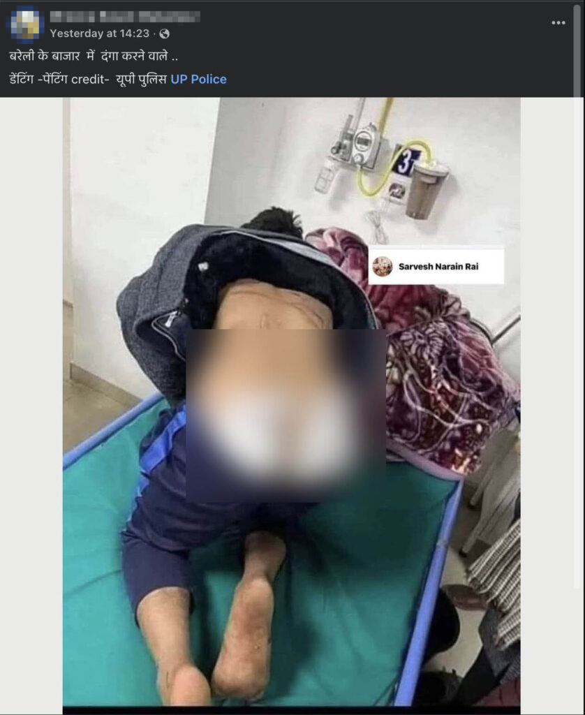 In this context, a photo (here, here, here, and here) of a person with wound bandages on his posterior is doing the rounds on social media, linking it to these riots. Social media users are sharing this photo with a description in Hindi that translates to ‘Those who rioted in the Bareilly market…Denting and painting Credit: UP Police, implying that the person in the photo was beaten by the UP Police during this unrest. We fact-check this claim through this article.