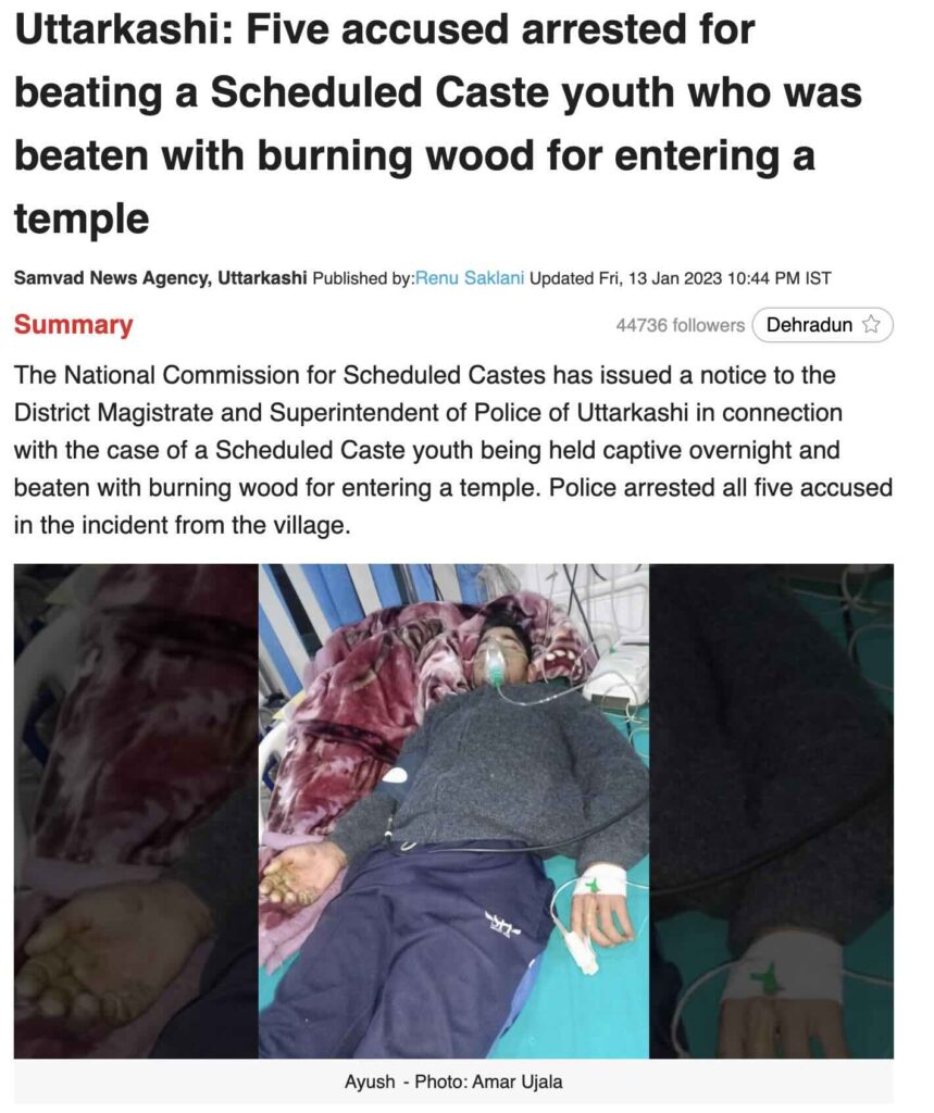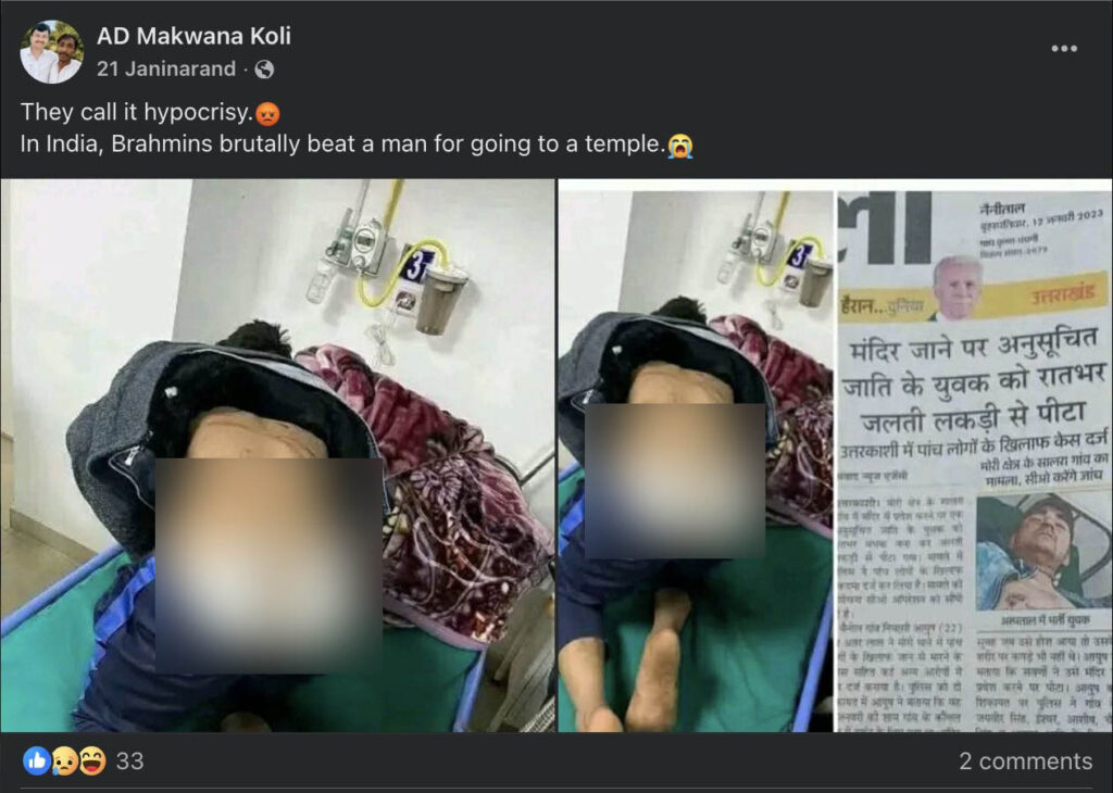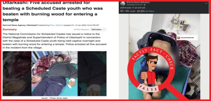 When we ran the viral photo through Google Lens, we found an older post of the same photograph on Facebook, dated January 2023. This post contained news clippings from 12 January 2023 describing how a Dalit youth from Salra village of Mori Block in Uttarkashi district was beaten with burning wood overnight for entering a temple. The photo matches exactly with the one in the viral post.
