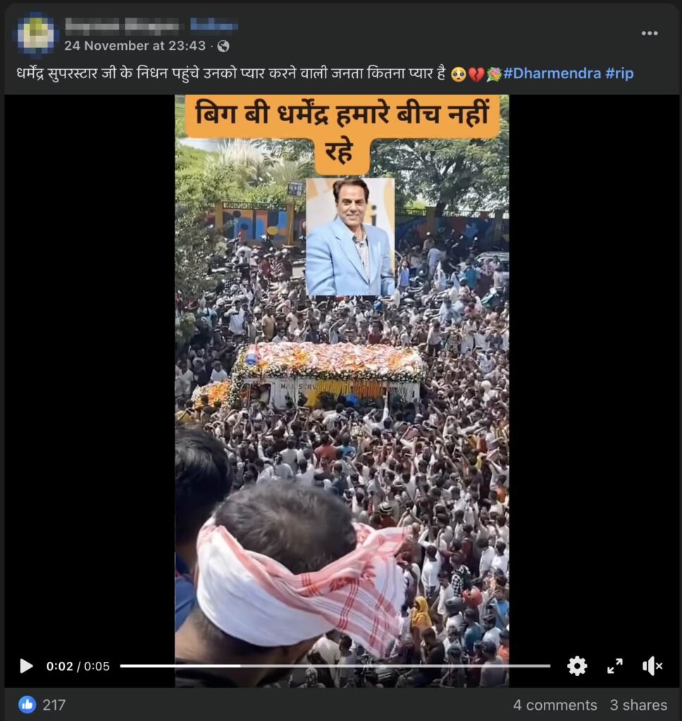 Claim: This video shows the final rites procession of veteran Bollywood actor Dharmendra, who passed away on 24 November 2025.