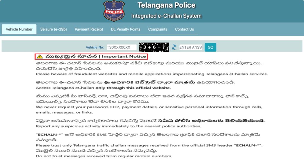 We also noticed that the Telangana government’s official e-challan website has a notice stating that fraudulent websites and mobile applications are operating by impersonating Telangana eChallan services, and users should be cautious. It emphasises that Telangana eChallan services should be accessed only through the official website. The notice clarifies that authorities never request passwords, OTPs, payment details, or other personal information through phone calls, emails, messages, or links. It also advises reporting any suspicious activity immediately to the nearest police authorities and instructs users to trust only Telangana traffic challan messages received from the official SMS header “ECHALN-*”, while messages from regular mobile numbers should not be trusted.