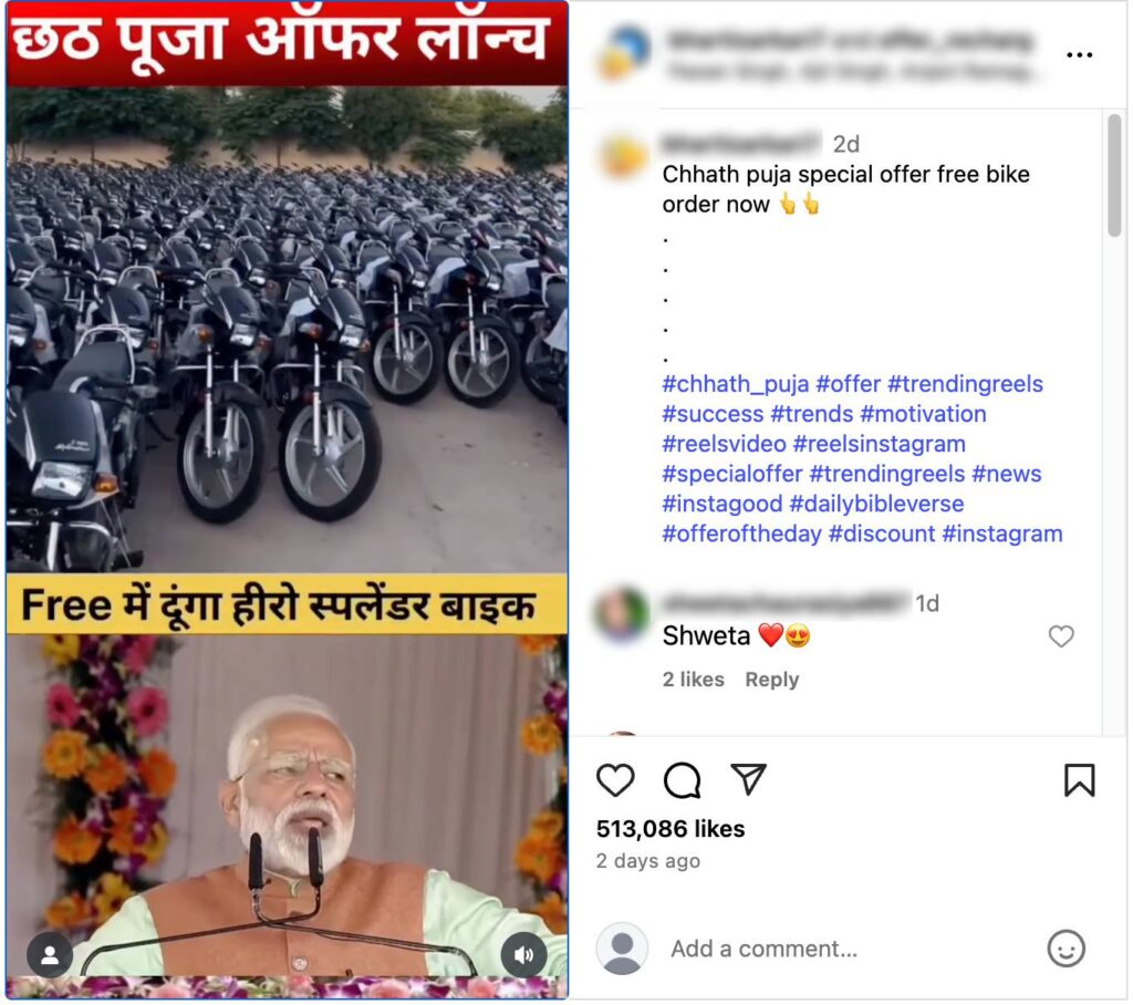 As India celebrates Chhath Puja 2025 (here, here, here, and here), a purported video claiming to show Prime Minister Modi announcing a free bike scheme for the occasion is going viral on social media platforms (here, here, here, and here). Through this article, let us fact-check the claim made in the post.