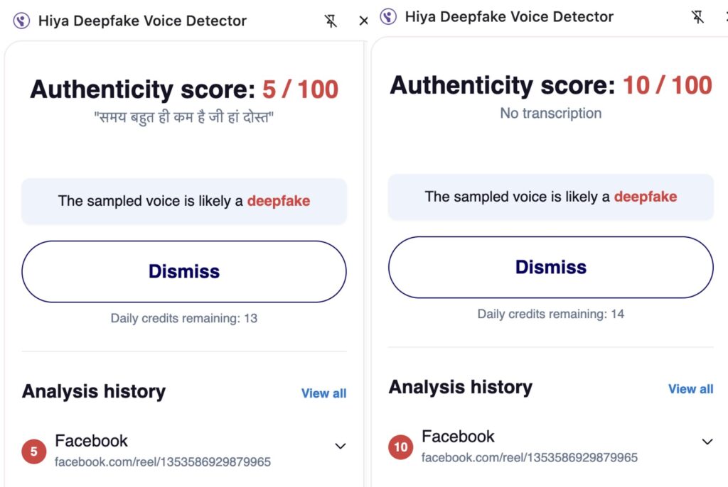 At no point in these speeches does he mention or announce any free smartphone scheme. We then analysed the viral videos using multiple AI voice-detection tools, including Resemble AI and Hiya. The results indicated that the audio in the viral videos is likely AI-generated. Based on this information, it is evident that the viral videos are fake and digitally altered. They were created by modifying the audio of the original footage.