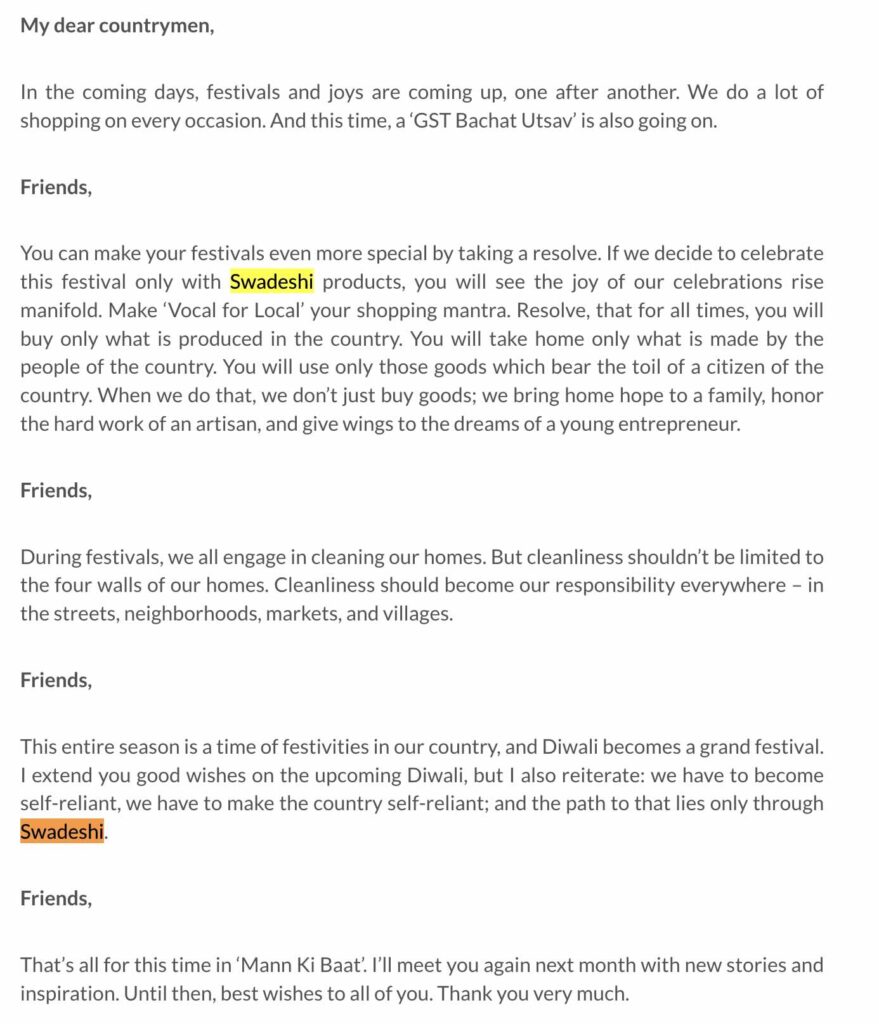 However, on 28 September 2025, Prime Minister Narendra Modi, in his monthly ‘Mann Ki Baat’ address, appealed to people to use swadeshi (Made-in-India) products during the forthcoming festive season of 2025, which includes Navratri, Dussehra, Diwali, Chhath, and other celebrations (here, here, & here). PM Modi has been consistently urging citizens to use Made-in-India products (here, here, here, here, & here).