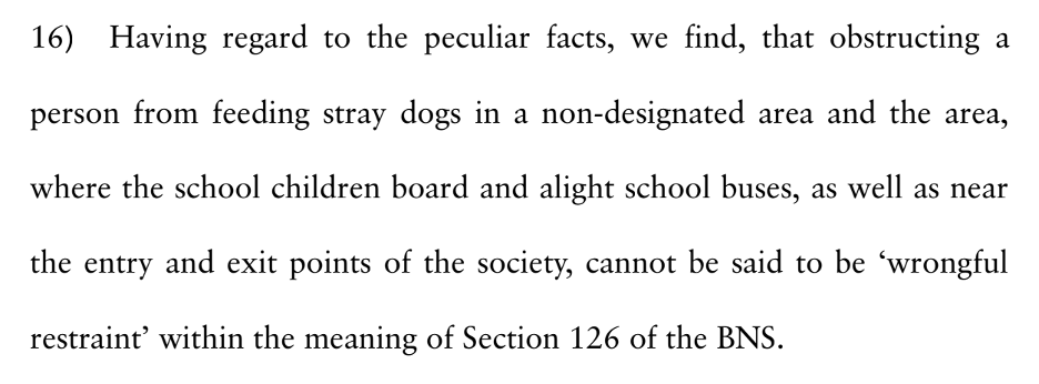 After examining the FIR, chargesheet, and witness statements, the Court held that the essential ingredients of wrongful restraint were not made out. The court observed that stopping the feeding of stray dogs in non-designated areas, particularly near school bus points and society entrances, could not be treated as illegal obstruction. The allegation of blocking the complainant’s car was found vague and unsupported.
