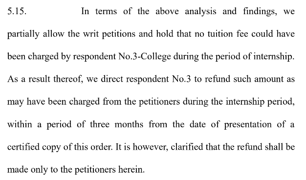 The petitions were partly allowed, and the respondent college was directed to refund all tuition fees collected from the petitioners for the internship period within three months.