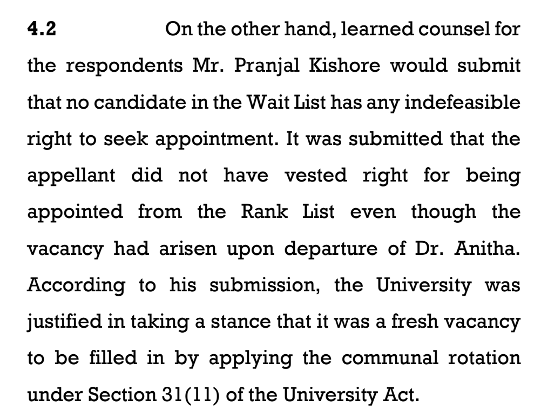 The appellant claimed entitlement to appointment on the ground that the rank list remained valid for two years under Section 31(10) of the Cochin University of Science and Technology Act, 1986. The University rejected her claim, stating that the vacancy created by resignation had to be filled in accordance with communal rotation under Section 31(11), which required offering the post to a Latin Catholic/Anglo-Indian candidate.
