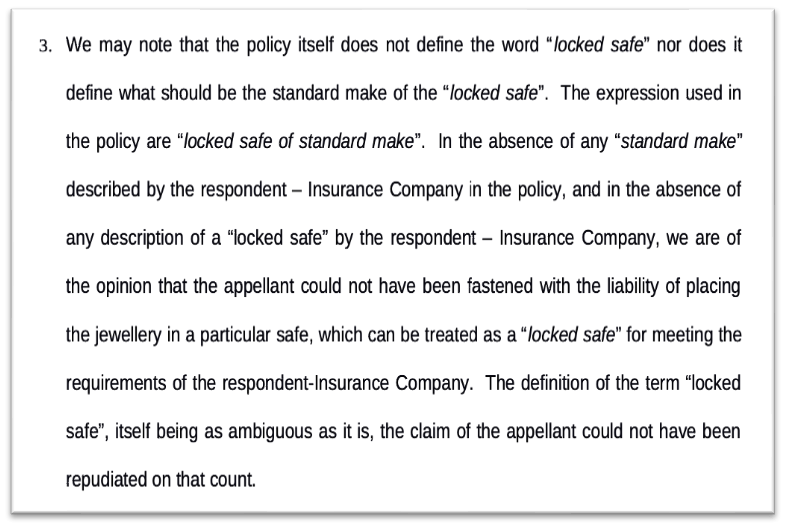 This was challenged in the Supreme Court. The Court allowed the appeal observing that it was unjustified on the part of the respondent to repudiate the claim of the appellant for the sum claimed. It observed that the insurance policy itself does not define the word ‘locked safe’ nor does it define what should be the standard make of the ‘locked safe’.