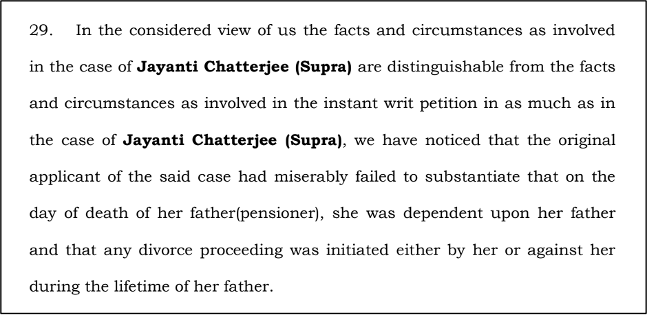 The Calcutta High Court observed that family pensions aim to support dependent members and must be interpreted broadly. It noted that since a legal process for divorce existed while her father was alive, Mita met the statutory requirements. The Court emphasised that Mita was clearly dependent on her father due to her husband’s desertion and that technical delays should not deny support to vulnerable family members.