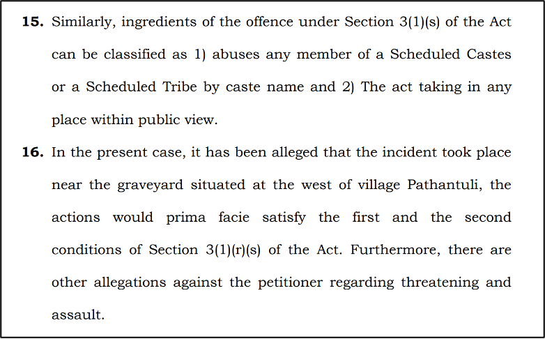 The Court observed that a village graveyard visible to others qualifies as a “place within public view.” Specifically, the Calcutta High Court held that abusing a person by calling them by their caste name, such as “Adivasi” or “Santhal”, in a place within public view, with the intent to humiliate, can amount to an offence under the Scheduled Castes and Scheduled Tribes (Prevention of Atrocities) Act, 1989. It refused to conduct a detailed inquiry into the truth of the claims at this early stage.