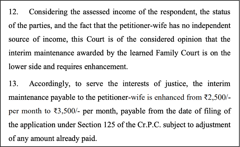Ultimately, the High Court allowed the wife’s petition and increased the monthly support. The judge ruled that the husband’s education and status required a fairer contribution toward his wife’s sustenance. The Court enhanced the interim maintenance from ₹2,500 to ₹3,500 per month, effective from the date she first filed the case. The husband was ordered to clear all back payments within three months, ensuring the wife receives more appropriate financial assistance during the ongoing legal trial.