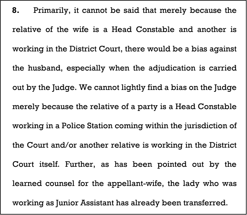 The Supreme Court observed that the High Court had made the transfer order without properly hearing the wife’s side. The judges clarified that the mere presence of a party’s relative in the police force or court staff does not automatically mean a judge will be biased. They noted that the Junior Assistant relative had already been moved to a different court and that judicial decisions are made by judges, not administrative staff. The Court found the husband’s claims of bias to be “inconsequential” and noted that his past legal manoeuvres appeared to be an attempt to mislead his wife.