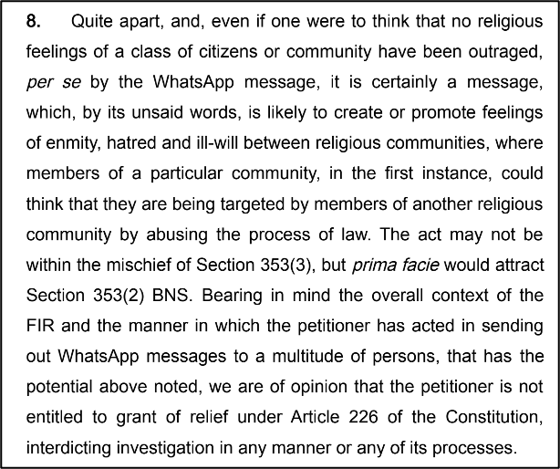 The Court observed that while the message may not explicitly use religious words, its “unsaid words” conveyed a subtle message that the petitioner’s community was being unfairly targeted through the abuse of legal process. The Court ruled that this message had the potential to create or promote feelings of enmity and hatred between religious communities.