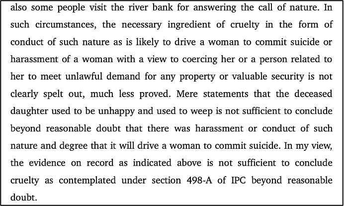 The High Court observed that there was “sufficient doubt” in the prosecution’s case. It noted that the evidence from the deceased’s parents mentioned only one instance of demanding and receiving Rs. 1,000, and no specific acts of physical or mental cruelty were proven beyond her being unhappy and weeping. The Court also noted that the parents did not mention any ill-treatment to the police when the initial missing person report was filed. The judges concluded that simply stating a daughter was unhappy and wept is not sufficient to prove the kind of harassment or mental torture needed to warrant a conviction for cruelty or abetment to suicide.