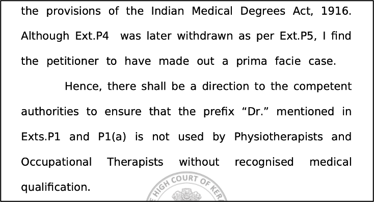 The Kerala High Court noted that there appears to be a clear conflict between the provisions of the Indian Medical Degrees Act, 1916, and the curriculum for Physiotherapy and Occupational Therapy. The Court found that the petitioner had made a prima facie case. The Court admitted the petition for hearing. Meanwhile, the competent authorities were directed to ensure that the prefix “Dr.” is not used by Physiotherapists and Occupational Therapists unless they hold a recognised medical qualification.