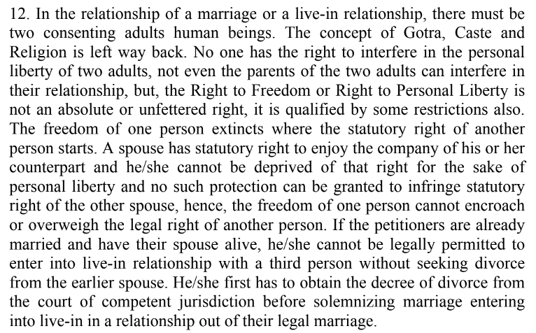 The Court held that personal liberty under Article 21 cannot be used to override the legal rights of a spouse. It explained that a live-in relationship is recognised only when both partners are legally free to marry. Since the woman’s marriage continued to exist, the relationship could not be considered a “relationship in the nature of marriage.”