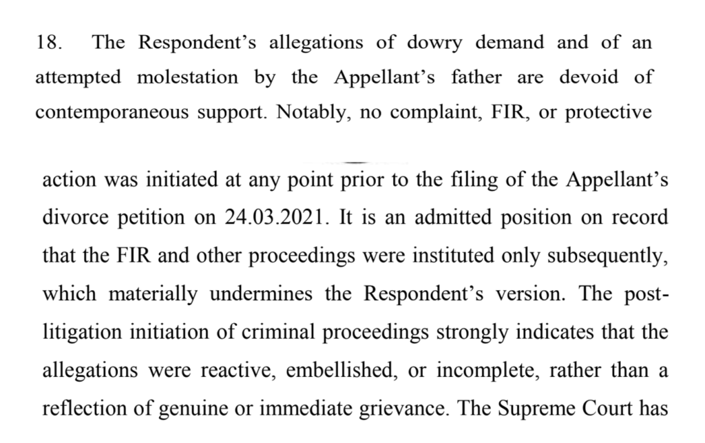 The High Court found that the husband’s testimony was consistent and supported by evidence. In contrast, the wife’s allegations of dowry harassment and criminal behaviour surfaced only after litigation began and were not backed by earlier complaints. The Court held that such delayed accusations cannot be treated as more credible than continuous conduct that clearly amounted to cruelty.
