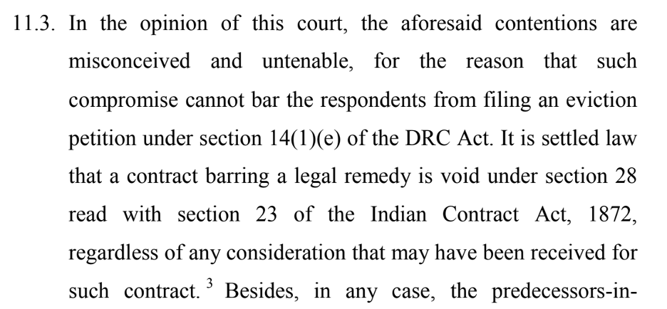 The tenants argued that a 2008 compromise in earlier proceedings barred the landlords from ever filing an eviction petition because they had agreed not to do so in exchange for an increase in rent. The Court held that such a clause is void under the Indian Contract Act because the law does not permit parties to contractually give up their right to approach a legal forum.