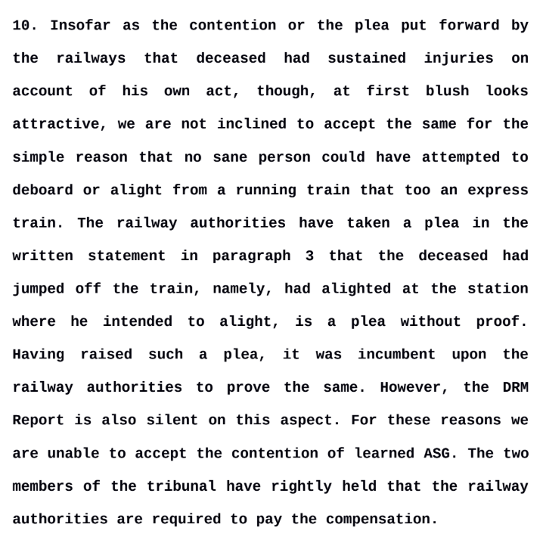 The case involved Shravan Kumar Gupta, who died after suffering injuries in a railway accident in May 2013. His parents sought compensation, stating that he had a valid ticket for travel from Satna to Maihar. The Railways argued that he had mistakenly boarded the Godan Express, which did not stop at Maihar, and must have jumped from the moving train. However, the Court noted that there was no evidence to support this claim.