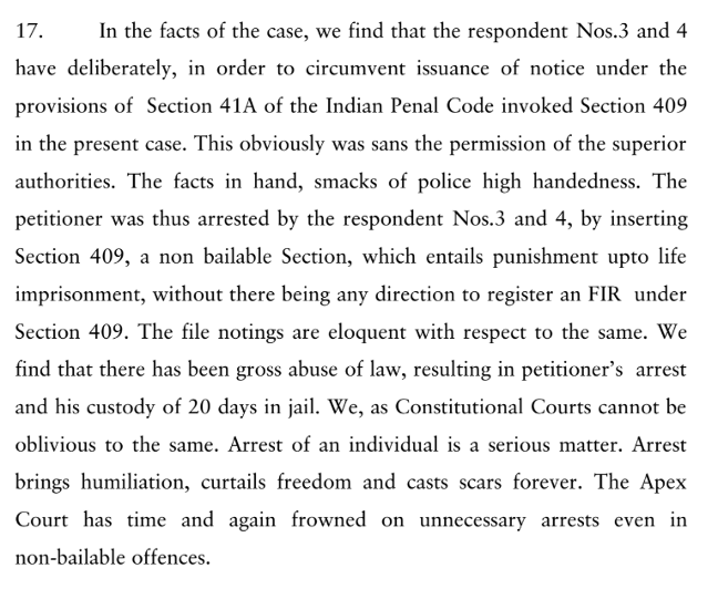 As a result, Nayak was detained for 20 days despite records showing he had retired from the disputed partnership in 2013. Citing the Supreme Court’s rulings in Arnesh Kumar vs. State of Bihar (2014) and Joginder Kumar vs. State of UP (1994), the Bench stressed that arrests should not be made routinely, warning that “arrest brings humiliation, curtails freedom, and casts scars forever.”