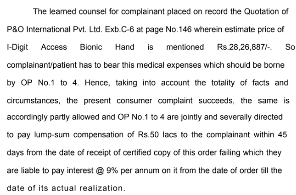 Relying on medical records, photographs, and PGIMER’s disability certificate, the Commission held the hospital accountable. The hospital’s decision to waive ambulance and remaining bills implied an acknowledgement of fault. Healing Hospital, Dr Sandeep Pal, Dr J.P. Singhvi, and Dr Maninder Kaur Bedi were directed to pay compensation within 45 days, with 9% annual interest applicable if delayed.