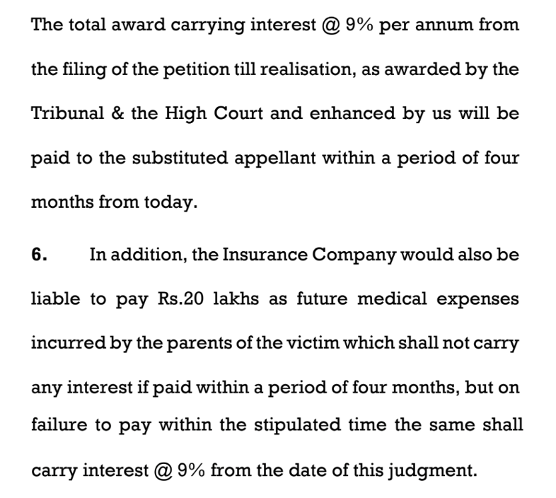 The Court enhanced total compensation to ₹40.34 lakh: ₹15.12 lakh for loss of income, ₹14 lakh under conventional heads, and ₹11.22 lakh for medical expenses. The insurance company was also directed to pay ₹20 lakh for future medical costs, interest-free if paid within four months; otherwise, 9% annual interest applies. The judgment underscores that minimum wages must account for the nature and scope of work, not just education.