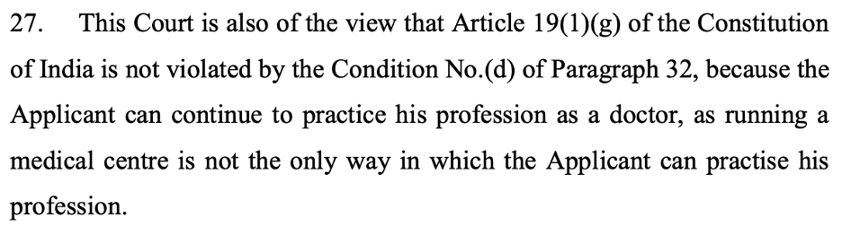 In Neeraj Agarwal vs. State (NCT of Delhi) & Anr., the Delhi High Court upheld a bail condition restricting a doctor from operating his medical centre, holding that it does not violate the fundamental right to livelihood under Article 19(1)(g) of the Constitution.