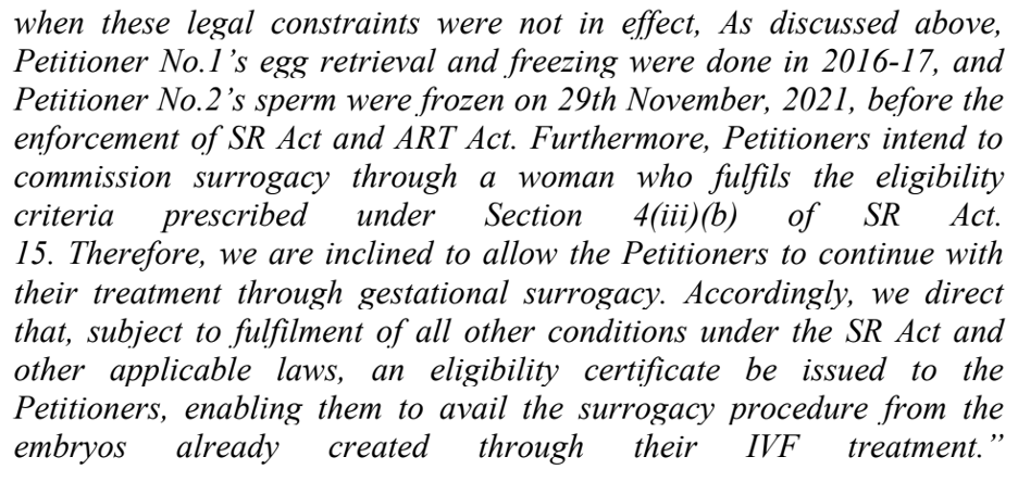 Holding that the petitioners’ surrogacy process had commenced before the Act’s implementation, the Court allowed them to proceed without a fresh eligibility certificate, subject to compliance with other statutory conditions.