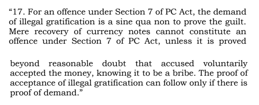 This ruling reinforces that conviction under the Prevention of Corruption Act requires clear proof of demand and acceptance, not mere possession of tainted currency.