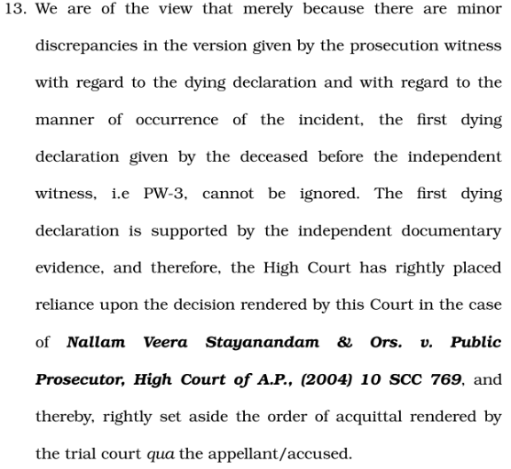 The Court held that minor variations in dying declarations do not render them unreliable when the first statement is consistent and supported by independent evidence. Dismissing the appeal, it affirmed the conviction and sentence.