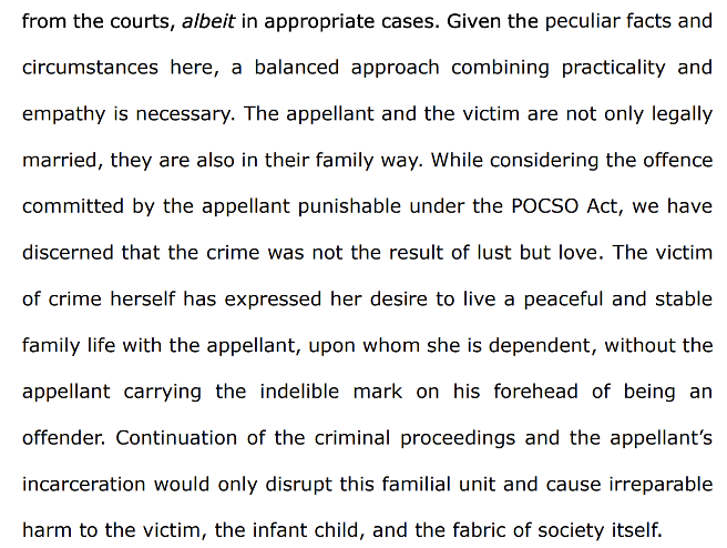 In K. Kirubakaran vs. State of Tamil Nadu, the Supreme Court quashed the conviction of a man under Section 366 IPC and Section 6 of the POCSO Act, holding that in exceptional circumstances, justice and compassion may prevail over rigid application of law.