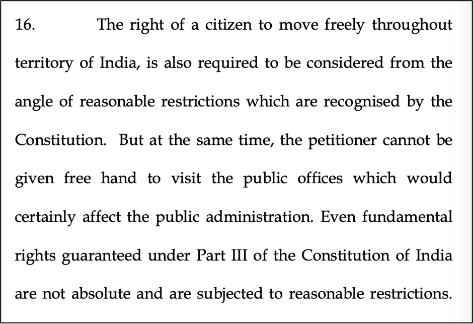 The court observed that since the petitioner’s employment was terminated in 2004, he had no absolute right to access the office. The court noted that his conduct and intention to visit the office were not genuine and were aimed at obstructing its smooth functioning. The court referenced a similar case, which stated that no individual has a fundamental right to harass public officers by repeatedly filing complaints. While citizens have the right to file complaints, filing frivolous and repeated ones burdens public officials. The court emphasised that even fundamental rights are subject to reasonable restrictions and that a citizen cannot have a “free hand to visit the public offices which would certainly affect the public administration”.