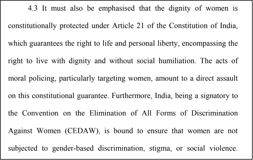 The High Court, while not cancelling the bail, strongly condemned “moral policing” as a “dangerous and regressive practice” that infringes upon the constitutional right to dignity and life under Article 21. It also noted that it contributes to social ostracisation and can push victims to suicide.