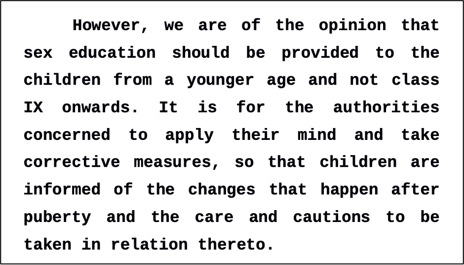 The Court observed that while the State’s affidavit detailed the curriculum for classes IX to XII, sex education should begin at a younger age. The Court noted that authorities should take corrective measures to inform children about changes after puberty and related precautions.