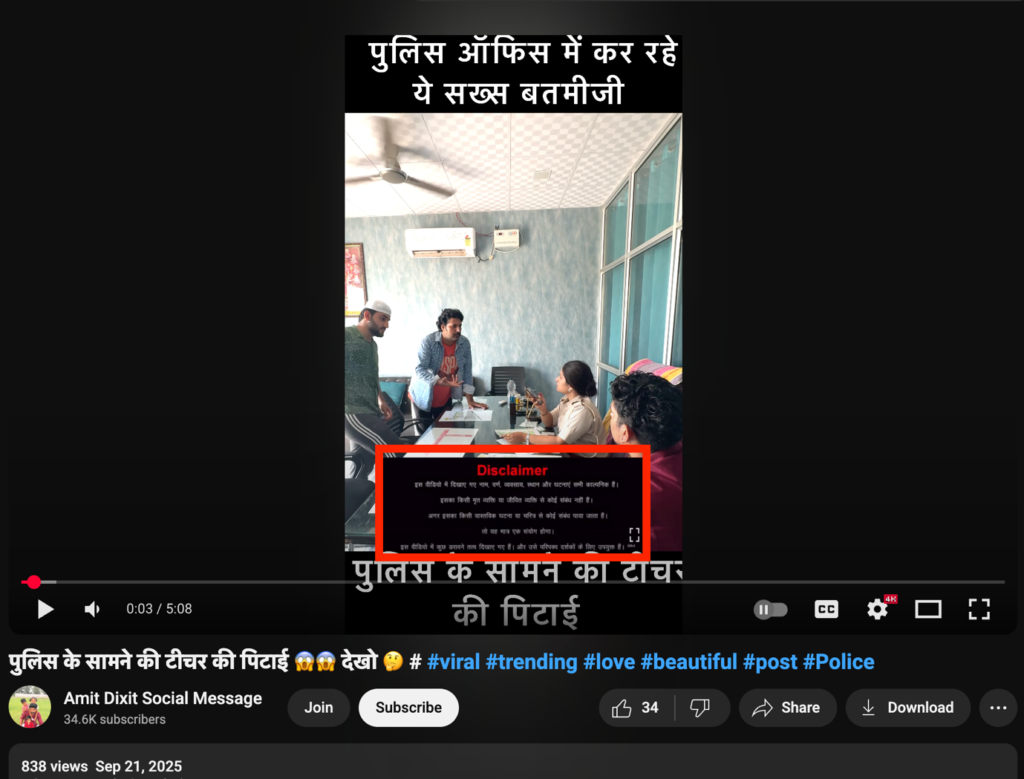 A reverse image search of the viral video led us to the full version uploaded on the YouTube channel “Amit Dixit Social Message” on 21 September 2025. At the beginning of the video, a disclaimer clearly states that it is a scripted video made for entertainment purposes and does not depict any real incident.