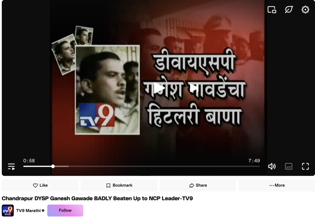 ముందుగా, ఈ వీడియో యొక్క కీ ఫ్రేములను ఉపయోగిస్తూ రివర్స్ ఇమేజ్ సెర్చ్ చెయ్యగా, ఇది వీడియో-షేరింగ్ ప్లాట్ఫామ్ డైలీమోషన్లో టీవీ9 మరాఠీ 2013లో ప్రచురించిన వీడియోకు దారి తీసింది. “Chandrapur DYSP Ganesh Gawade BADLY Beaten Up to NCP Leader-TV9” అనే శీర్షికతో ఇది ప్రచురించబడింది.