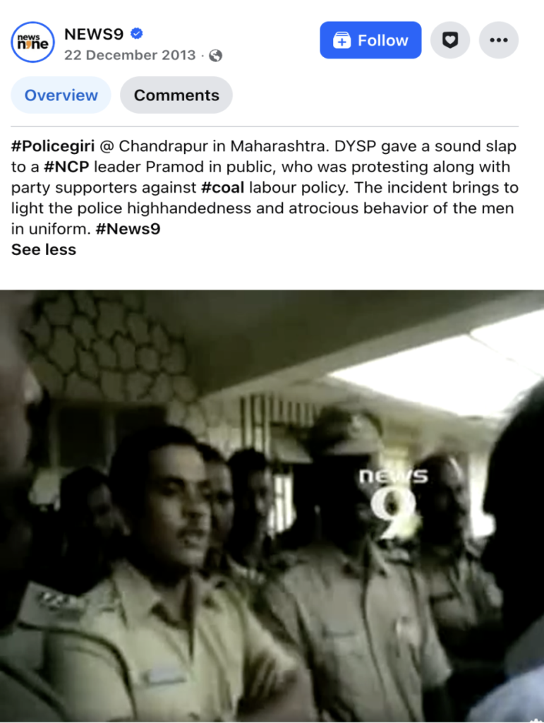 దీన్ని ఆధారంగా తీసుకొని తగిన కీ వర్డ్స్ ఉపయోగిస్తూ ఇంటర్నెట్లో వెతికితే, NEWS9 ప్రచురించిన వార్తకు దారి తీసింది. ఈ సంఘటన మహారాష్ట్రలోని చంద్రపూర్లో 2013లో జరిగింది. బొగ్గు కార్మిక పాలసీకి వ్యతిరేకంగా పార్టీ మద్దతుదారులతో కలిసి నిరసన తెలుపుతున్న NCP నాయకుడు ప్రమోద్ మోహద్ ని DYSP బహిరంగంగా చెంపదెబ్బ కొట్టాడు. దీనికి సంబంధించిన మరిన్ని మీడియా నివేదికలను ఇక్కడ, ఇక్కడ చూడవచ్చు.