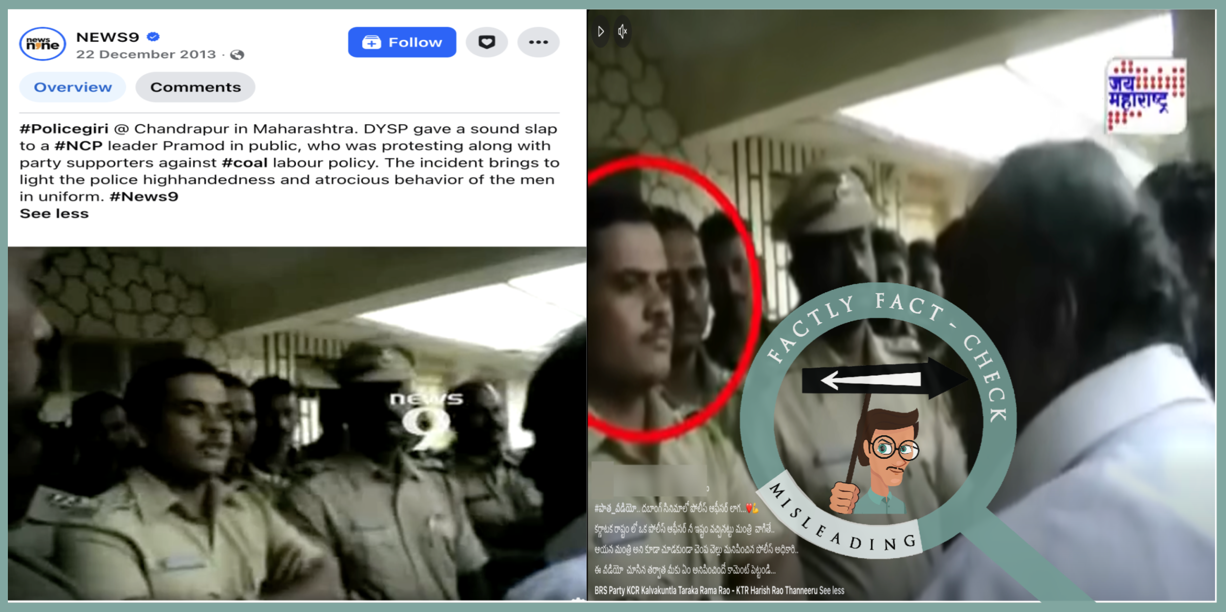 దీన్ని ఆధారంగా తీసుకొని తగిన కీ వర్డ్స్ ఉపయోగిస్తూ ఇంటర్నెట్లో వెతికితే, NEWS9 ప్రచురించిన వార్తకు దారి తీసింది. ఈ సంఘటన మహారాష్ట్రలోని చంద్రపూర్లో 2013లో జరిగింది. బొగ్గు కార్మిక పాలసీకి వ్యతిరేకంగా పార్టీ మద్దతుదారులతో కలిసి నిరసన తెలుపుతున్న NCP నాయకుడు ప్రమోద్ మోహద్ ని DYSP బహిరంగంగా చెంపదెబ్బ కొట్టాడు. దీనికి సంబంధించిన మరిన్ని మీడియా నివేదికలను ఇక్కడ, ఇక్కడ చూడవచ్చు.