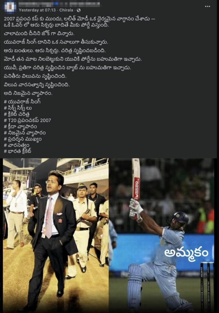 2007 క్రికెట్ ప్రపంచ కప్కి ముందు, ఒకే ఓవర్లో ఆరు సిక్సర్లు కొట్టిన వారికి ఒక పోర్షే కారు ఇస్తానని లలిత్ మోదీ ఆటగాళ్లకి హామీ ఇచ్చాడని, యువరాజ్ సింగ్ ఒకే ఓవర్లో ఆరు సిక్సులు కొట్టిన తర్వాత, లలిత్ మోదీ అతనికి 91 లక్షల రూపాయల కారును బహుమానంగా ఇచ్చాడని, తను ఆ బ్యాటుని 7 కోట్లకి వేలంలో అమ్మేసాడని చెప్తున్న పోస్ట్ ఒకటి సోషల్ మీడియాలో షేర్ చేయబడుతుంది. అసలు, ఈ క్లెయిమ్ వెనుక ఎంత నిజం ఉందో ఈ ఆర్టికల్ ద్వారా చూద్దాం.