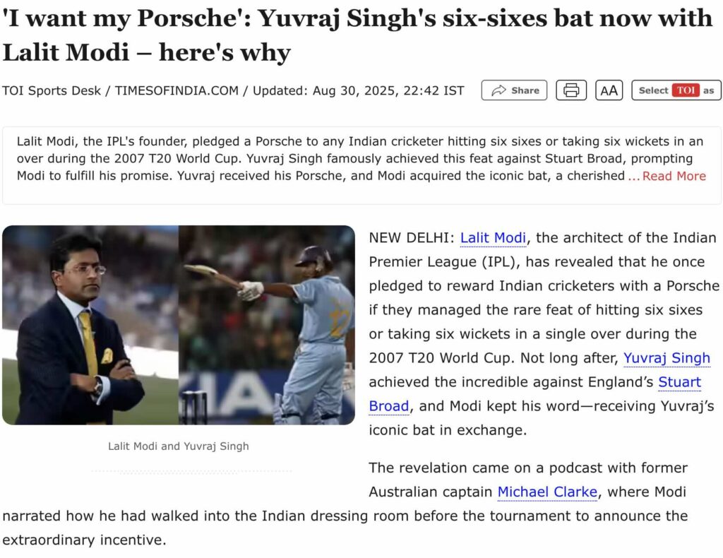 చివరగా, 2007 క్రికెట్ ప్రపంచ కప్లో ఒకే ఓవర్లో ఆరు సిక్సర్లు కొట్టినందుకు యువరాజ్ సింగ్కు లలిత్ మోదీ ఒక 91 లక్షల పోర్షే బహుమానంగా ఇచ్చి, ఆ బ్యాటును 7 కోట్లకు వేలంలో అమ్మేసాడని ఒక తప్పుడు కథనాన్ని షేర్ చేస్తున్నారు.