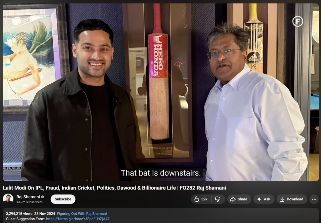 ఇక ఈ విషయంపై లలిత్ మోదీ ఏమని అన్నాడని తెలుసుకోవడానికి, తగిన కీవర్డ్స్ ఉపయోగించి ఇంటర్నెట్లో వెతకగా, మాకు ఈ విషయాన్ని గురించి తను ‘Raj Shamani’ పోడ్కాస్ట్, ఆస్ట్రేలియా క్రికెటట్ స్టుయర్ట్ క్లార్క్ యొక్క పోడ్కాస్ట్లలో మాట్లాడాడని మాకు తెలిసింది (ఇక్కడ, ఇక్కడ, ఇక్కడ, ఇక్కడ).