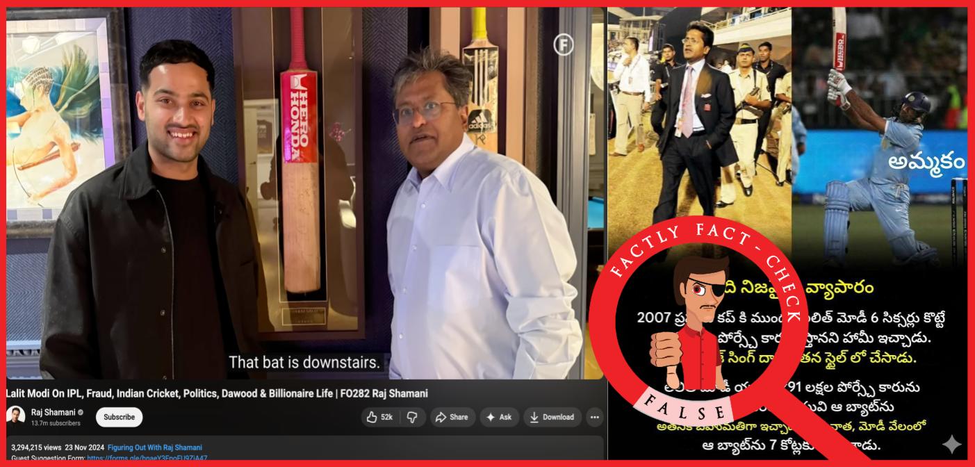 క్లెయిమ్: 2007 క్రికెట్ ప్రపంచ కప్లో ఒకే ఓవర్లో ఆరు సిక్సర్లు కొట్టినందుకు యువరాజ్ సింగ్కు లలిత్ మోదీ ఒక 91 లక్షల పోర్షే కారు బహుమానంగా ఇచ్చి, ఆ బ్యాటును 7 కోట్లకు వేలంలో అమ్మేశాడు.