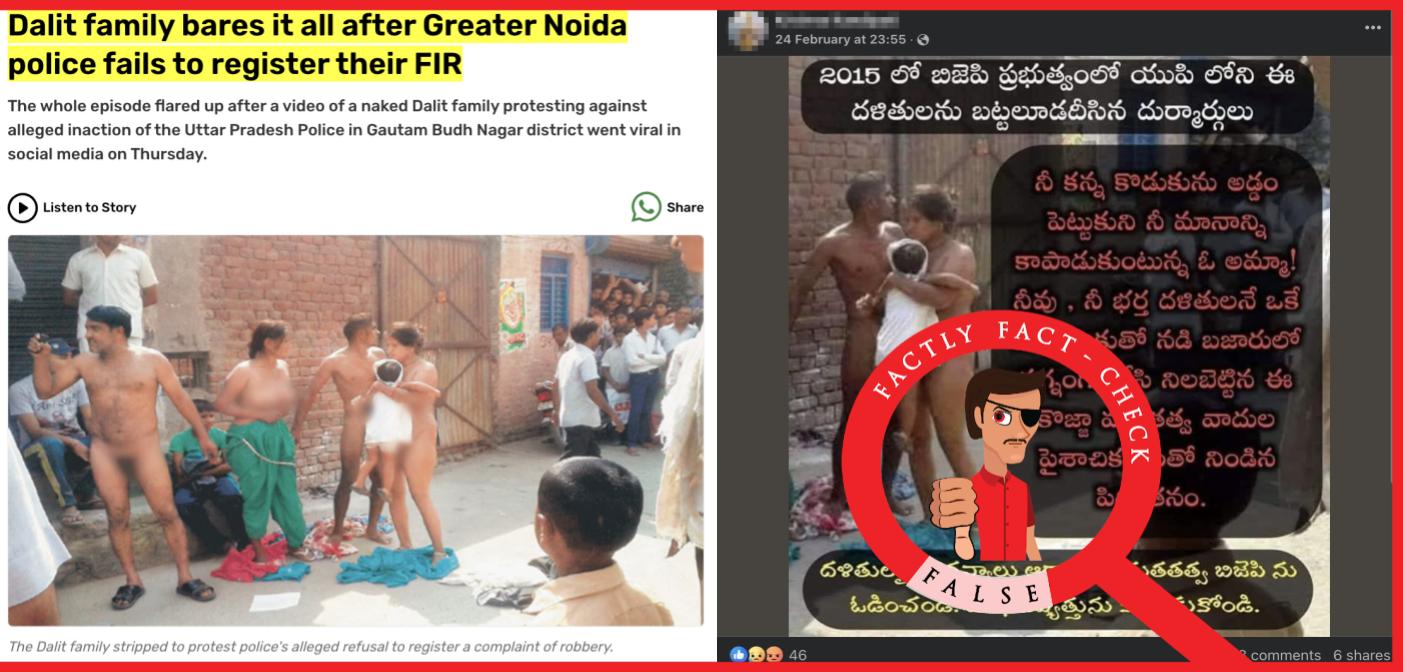 పోస్ట్లో షేర్ చేయబడిన ఫోటోను రివర్స్ ఇమేజ్ సెర్చ్ చేసినప్పుడు, వైరల్ ఫోటో పూర్తి కాపీ 10 అక్టోబర్ 2015న ఇండియా టుడే ప్రచురించిన ఒక వార్తా కథనంలో మాకు లభించింది. ఉత్తరప్రదేశ్లోని గౌతమ్ బుద్ధ్ నగర్ జిల్లాలోని డంకౌర్ పోలీస్ స్టేషన్ వెలుపల నగ్నంగా నిరసన తెలుపుతున్న ఒక దళిత కుటుంబం దృశ్యాలు ఇవి అని ఈ వార్తా కథనం నివేదించింది. ఒక దోపిడీ ఫిర్యాదును నమోదు చేయడానికి పోలీసులు నిరాకరించారని ఆరోపించి వారు ఈ నిరసన తెలిపారని ఈ కథనం తెలిపింది.