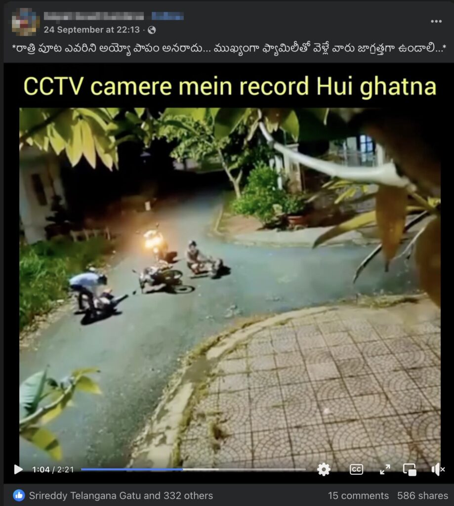 ఒక రోడ్డుపైన ఇద్దరు వ్యక్తులు గాయాలతో పడిపోయినట్లు నటిస్తూ, వీరికి సహాయం చేయడానికి ఆగిన మరో ఇద్దరిని కొట్టి, వారి బైక్ దొంగిలించిన సీసీటీవీ విజువల్స్ (ఇక్కడ, ఇక్కడ, ఇక్కడ) సోషల్ మీడియాలో వైరల్ అవుతున్నాయి. ‘రాత్రి పూట ఎవరిని అయ్యో పాపం అనరాదు… ముఖ్యంగా ఫ్యామిలీతో వెళ్లే వారు జాగ్రత్తగా ఉండాలి’ అని చెప్తూ ఈ వీడియోని సోషల్ మీడియా యూజర్లు షేర్ చేస్తున్నారు. అసలు, ఈ క్లెయిమ్ వెనుక ఎంత నిజం ఉందో ఈ ఆర్టికల్ ద్వారా చూద్దాం.