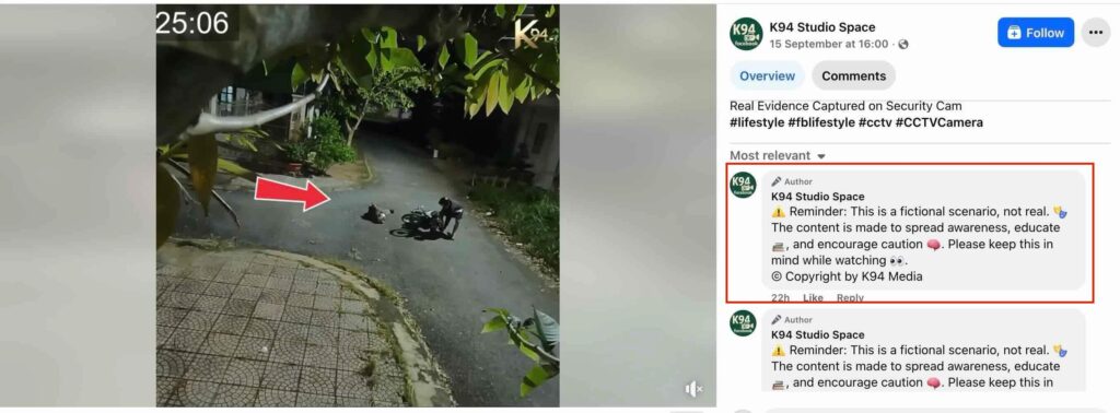 ఈ వీడియో యొక్క కామెంట్ సెక్షన్లో ‘K94 Studio Space’ వారు కామెంట్ చేస్తూ, ఇది ఒక ఫిక్షనల్ వీడియో అని, నిజంగా జరిగిన సంఘటన కాదని చెప్పారు. ఈ వీడియోను వారు ప్రజల్లో అవగాహన కలుగ చేయడానికి తయారు చేశారని, వారు ఈ కామెంట్ ద్వారా తెలియ చేశారు.