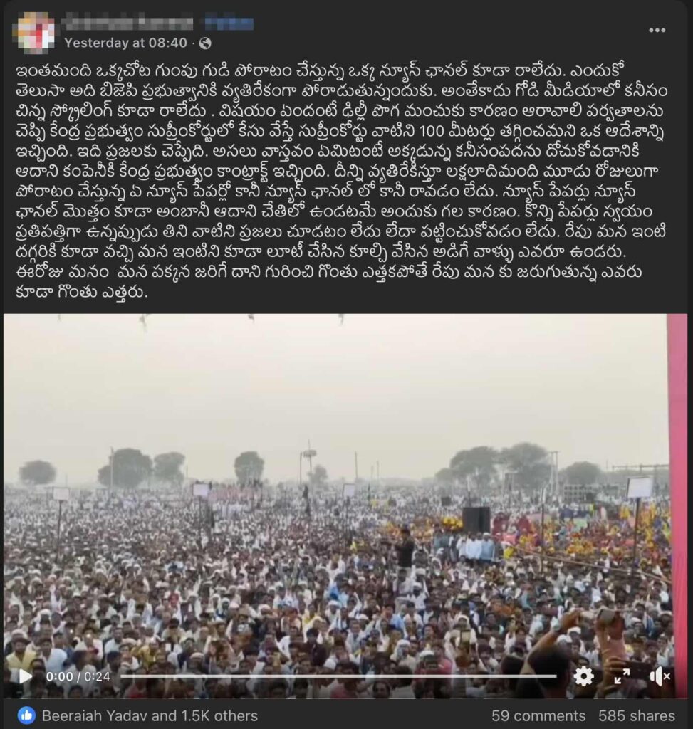ఈ నేపథ్యంలో, ఒక సభలో పెద్ద ఎత్తున జనం గుమిగూడి ఉన్న వీడియో (ఇక్కడ, ఇక్కడ, ఇక్కడ) ఒకటి సోషల్ మీడియాలో షేర్ చేయబడుతోంది. ఆరావళి పర్వత శ్రేణులపై సుప్రీంకోర్టు తీసుకున్న నిర్ణయాన్ని వ్యక్తిరేకిస్తూ జరిగిన ఒక నిరసనకు చెందిన వీడియో ఇది అని చెప్తూ సోషల్ మీడియా యూజర్లు క్లెయిమ్ చేస్తున్నారు. అసలు, ఈ క్లెయిమ్ వెనుక ఎంత నిజం ఉందో ఈ ఆర్టికల్ ద్వారా చూద్దాం.