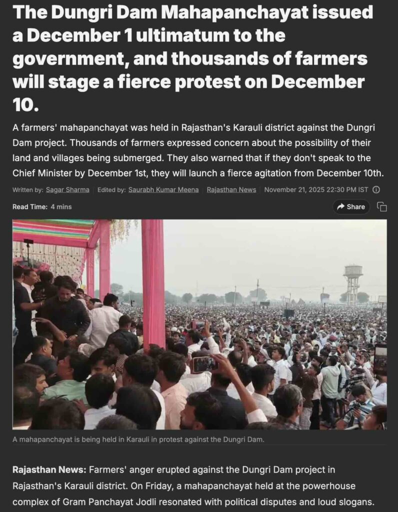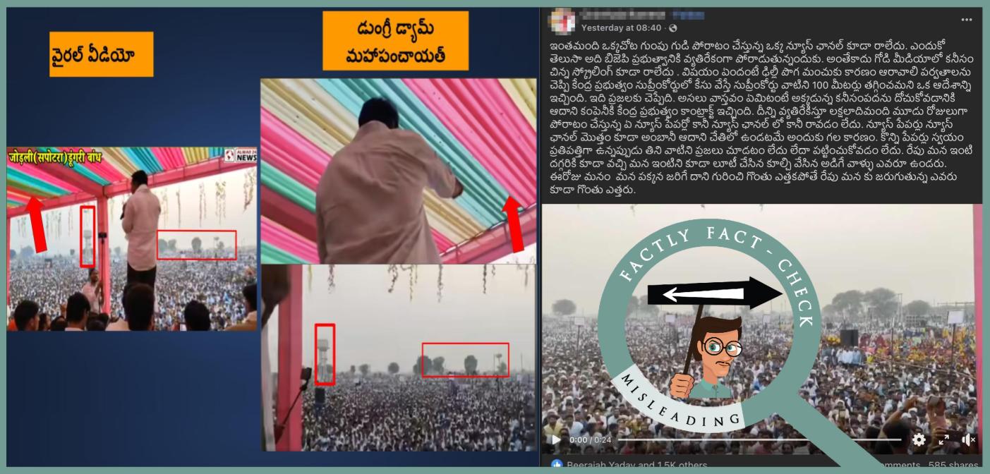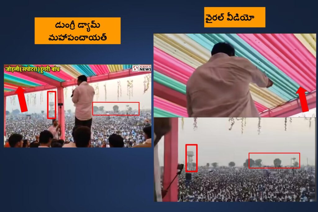 రాజస్థాన్లోని బానస్ నదిపై కట్టడానికి ప్రతిపాదనలో ‘డుంగ్రీ డ్యామ్’కు వ్యతిరేకంగా 21 నవంబర్ 2025న రాజస్థాన్లోని కరౌలి జిల్లాలో ఉన్న, జోడ్లి గ్రామంలోని పవర్ హౌస్ కాంప్లెక్ష్లో జరిగిన ఒక ‘మహాపంచాయత్’కు చెందిన వార్తా కథనాలు ఇవి (ఇక్కడ, ఇక్కడ). ఈ కార్యక్రమంలో రైతు నాయకుడు రాకేష్ తికాయత్, రాజకీయ నాయకుడు నరేష్ మీనాతో సహా చాలా మంది నాయకులు పాల్గొన్నారు. ‘డుంగ్రీ డ్యామ్’ కట్టడం వల్ల తమ ఇల్లు, స్థలాలు నీటమయం అయిపోతాయని, దానికి విరుద్ధంగా స్థానిక గ్రామాలకు చెందిన ప్రజలు ఈ ‘మహాపంచాయత్’ సభలో పాల్గొన్నారు. ఈ సభకు సంబంధించిన వీడియో రిపోర్టులలో, వైరల్ వీడియోలో కనిపిస్తున్న స్టేజి డెకరేషన్, దూరంగా కనిపిస్తున్న వాటర్ ట్యాంకు మనం చూడవచ్చు.
