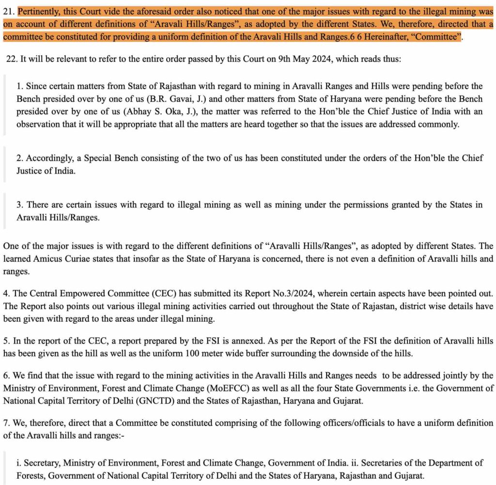 సుప్రీం కోర్టులో పెండింగులో ఉన్న రెండు కేసుల విషయంలో ఆరావళి పర్వతాలకు ఒక సరైన నిర్వచనం (definition/classification) ఇవ్వాలి అన్న విషయాన్ని సుప్రీం కోర్టు (Suo Moto)గా తీసుకొని, ఆరావళి పర్వత శ్రేణులకు ఒక సరైన నిర్వచనం ఇవ్వాలనే విషయం నిమిత్తమై, ఒక కమిటీని ఏర్పాటు చేయాలని ఆదేశాలు ఇచ్చింది. ఆ కమిటీ ఇచ్చిన సిఫార్సుల మేరకు వారు ఈ కొత్త నిర్వచనాన్ని ఆమోదించారు (ఇక్కడ, ఇక్కడ, ఇక్కడ, ఇక్కడ).