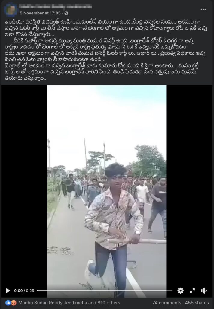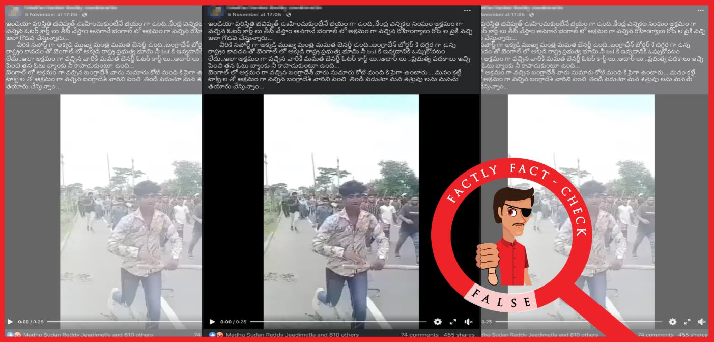 ‘కేంద్ర ఎన్నికల సంఘం అక్రమం గా వచ్చిన ఓటర్ కార్డ్ లు తీసి వేస్తాం అనగానే బెంగాల్ లో అక్రమంగా వచ్చిన రోహింగ్యాలు రోడ్ల పైకి వచ్చి ఇలా గొడవ చేస్తున్నారు’ అని చెప్తున్న వీడియో (ఇక్కడ, ఇక్కడ, ఇక్కడ, ఇక్కడ) ఒకటి సోషల్ మీడియాలో షేర్ చేయబడుతోంది. ఈ వీడియోలో కొందరు వ్యక్తులు రోడ్డుపై నినాదాలు చేస్తూ నడవడం మనం చూడవచ్చు. పశ్చిమ బెంగాల్ సహా 9 రాష్ట్రాలు, మూడు కేంద్ర పాలిత ప్రాంతాల్లో ఎన్నికల సంఘం స్పెషల్ ఇంటెన్సివ్ రివిజన్ (SIR) ప్రక్రియ ఫేజ్-2, 4 నవంబర్ 2025న మొదలు పెట్టిన నేపథ్యంలో (ఇక్కడ, ఇక్కడ) ఈ వీడియో సోషల్ మీడియాలో షేర్ చేయబడుతోంది. అసలు ఈ క్లెయిమ్ వెనుక ఎంత నిజం ఉందో ఈ ఆర్టికల్ ద్వారా చూద్దాం.