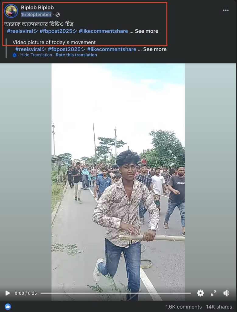 ఈ వీడియో యొక్క హై క్వాలిటీ వెర్షన్ను ‘Biplob Biplob’ అనే వ్యక్తి తన ఫేస్బుక్ పేజీలో 15 సెప్టెంబర్ 2025న అప్లోడ్ చేశారు. బంగ్లా భాషలో ఉన్న ఈ వీడియో యొక్క వివరణను తెలుగులోకి తర్జుమా చేసి చూస్తే, అది -’ఈ రోజు ఉద్యమం యొక్క వీడియో ఫుటేజ్’ అని ఉంది. Biplob ఫేస్బుక్ పేజీలో తను బంగ్లాదేశ్లోని ఢాకాలో ఉన్న ఫరీద్పుర్ నివాసి అని పేర్కొన్నారు.