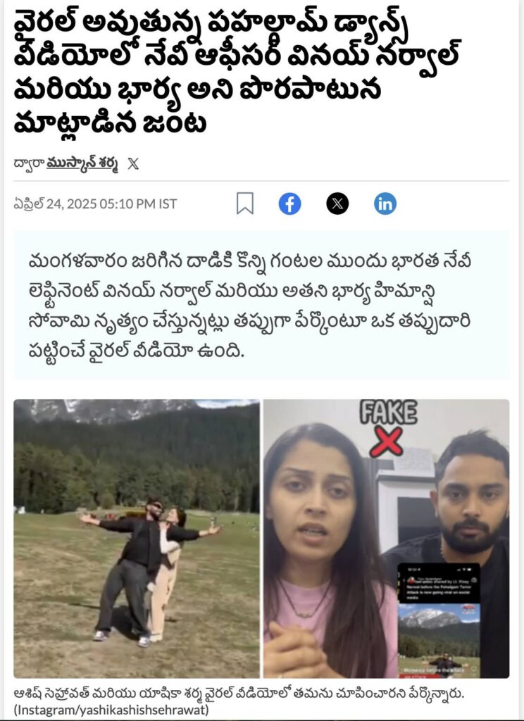 పహల్గామ్లో ఉగ్రదాడిలో మరణించిన భారత నేవీ లెఫ్టినెంట్ వినయ్ నర్వాల్, అతని భార్య హిమాన్షి సోవామి దాడికి కొద్ది నిమిషాల ముందు ఆనందంగా నృత్యం చేస్తున్న వీడియో అంటూ వేరే జంటకు సంబంధించిన వీడియోను తప్పుగా షేర్ చేస్తున్నారు అంటూ పలు మీడియా సంస్థలు కూడా కథనాలు ప్రచురించాయి (ఇక్కడ, ఇక్కడ, ఇక్కడ).